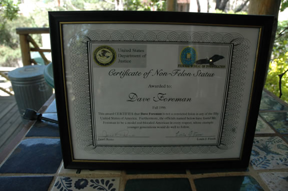 Non-Felon Status Award given to Dave Foreman - by ML Lincoln